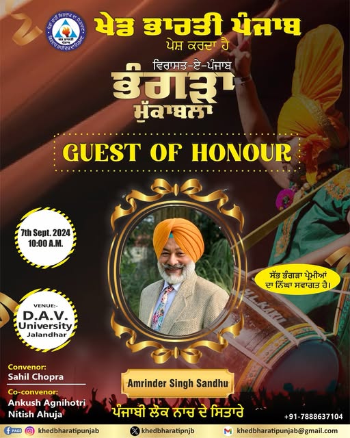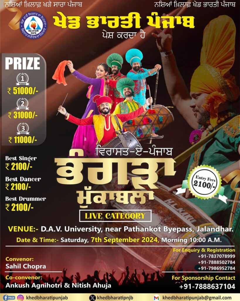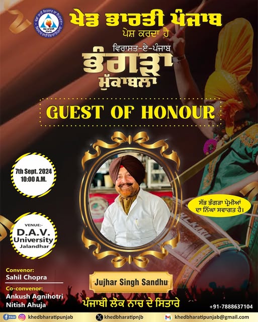 In September 2024, the echo of dhols and the vibrant beats of Bhangra brought DAV University, Jalandhar to life as Khed Bharati Punjab proudly hosted the first-ever Viraasat-e-Punjab Bhangra Cup—a grand celebration of Punjab’s living cultural heritage.